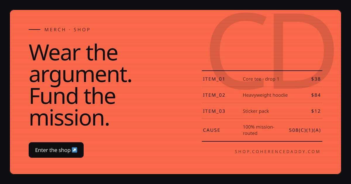 Share URL · click to selecthttps://coherencedaddy.com/shop?utm_source=x&utm_medium=social&utm_campaign=og-merch-classic